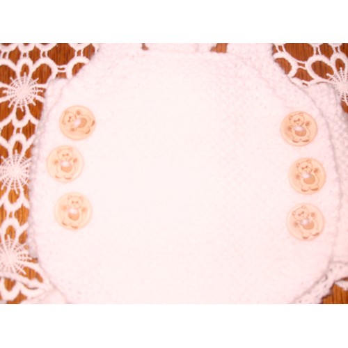 ensemble bébé composé d'un bonnet béguin, une salopette bloomer facile à enlever grâce aux boutons devant et bretelles croisées au dos et une paire de chaussons.